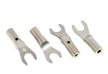 Description: Allows a banana terminated cable to be connected to a binding post using this 9mm/.35” spade. Our BTS 9 is the same spade as our CGMS-9R-XS which has a 4mm termination hole. Has a slight angle of 13* for increased cable clearance. Sold as a set of 4.